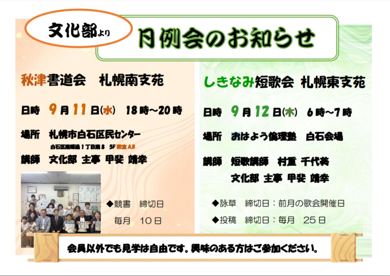 秋津書道会・しきなみ短歌会9月例会のお知らせ