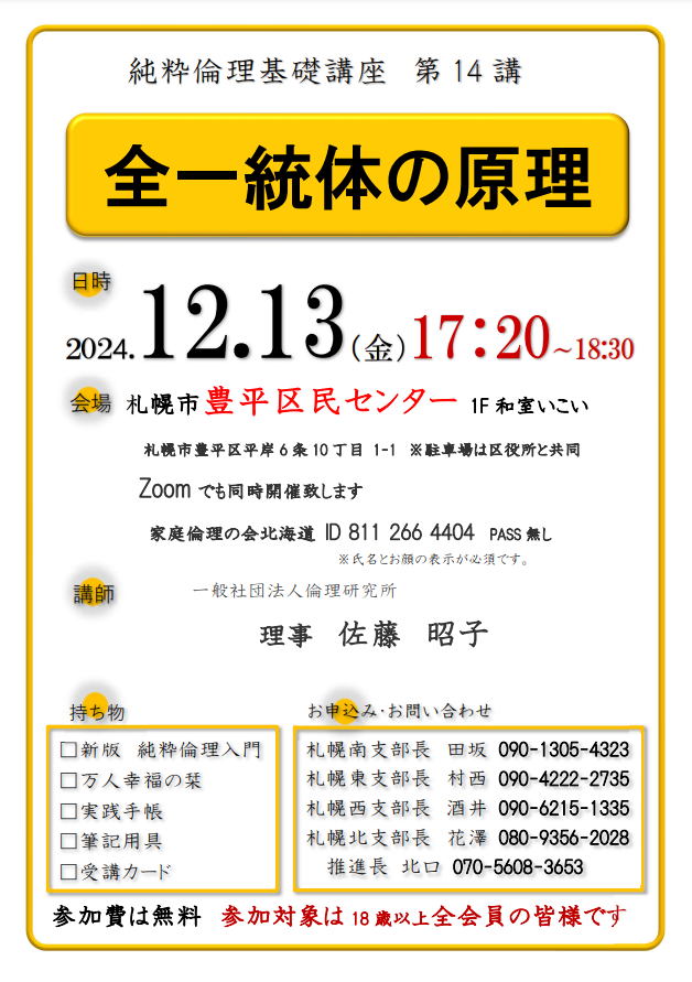 12月13日純粋倫理基礎講座のご案内 Posted on 2024-11-20 by 家庭倫理の会北海道 Related Post R8.1.7 秋津書道会 例会・1.8 しきなみ短歌会 歌会のお知らせ R8.1.4 新年式のお知らせ R8.2.14 子育てセミナーのお知らせ R7.12.10 秋津書道会例会・12.11 しきなみ短歌会例会のお知らせ R7.12.6 純粋倫理基礎講座 第2講のお知らせ 会場は札幌市豊平区平岸6条10丁目1-1ですお間違いないようお気をつけください。