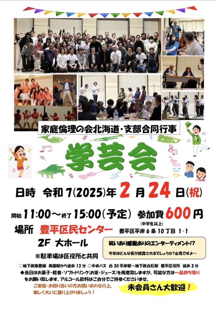 2月24日学芸会についてのお知らせ Posted on 2025-01-28 by 家庭倫理の会北海道 Related Post R8.1.7 秋津書道会 例会・1.8 しきなみ短歌会 歌会のお知らせ R8.1.4 新年式のお知らせ R8.2.14 子育てセミナーのお知らせ R7.12.10 秋津書道会例会・12.11 しきなみ短歌会例会のお知らせ R7.12.6 純粋倫理基礎講座 第2講のお知らせ 見会員の方も大歓迎です!!是非お越しください。