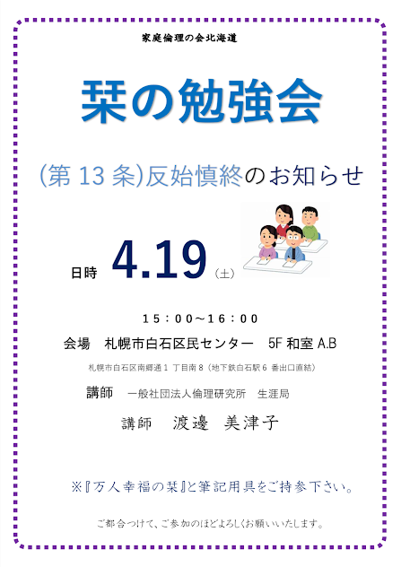 札幌市白石区民センターでの開催です。ご参加の場合は万人幸福の栞と筆記用具をご持参してください。