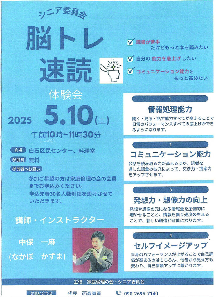5月10日 脳トレ速読体験会のご案内 Posted on 2025-04-26 by 家庭倫理の会北海道 Related Post R8.1.7 秋津書道会 例会・1.8 しきなみ短歌会 歌会のお知らせ R8.1.4 新年式のお知らせ R8.2.14 子育てセミナーのお知らせ R7.12.10 秋津書道会例会・12.11 しきなみ短歌会例会のお知らせ R7.12.6 純粋倫理基礎講座 第2講のお知らせ 先着30名までとなっておりますのでお早めにお申し込みください。