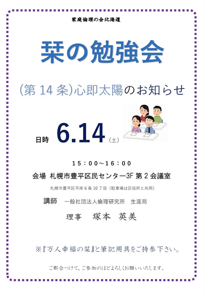 6月14日栞の勉強会のご案内 Posted on 2025-06-13 by 家庭倫理の会北海道 Related Post R8.1.7 秋津書道会 例会・1.8 しきなみ短歌会 歌会のお知らせ R8.1.4 新年式のお知らせ R8.2.14 子育てセミナーのお知らせ R7.12.10 秋津書道会例会・12.11 しきなみ短歌会例会のお知らせ R7.12.6 純粋倫理基礎講座 第2講のお知らせ 札幌市白石区民センターでの開催です。ご参加の場合は万人幸福の栞と筆記用具をご持参してください。