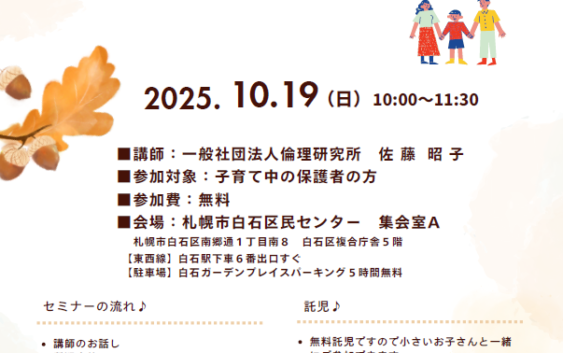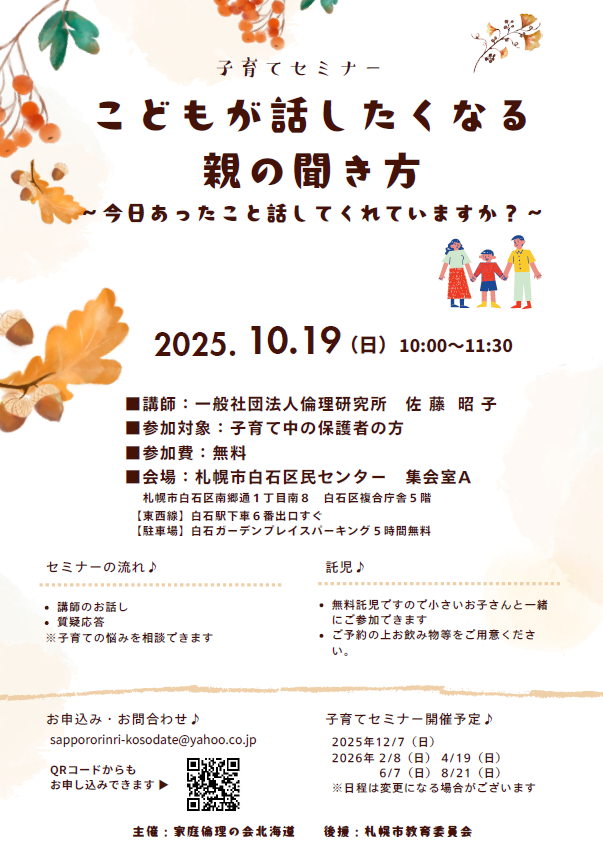 2025/10/19 子育てセミナーのお知らせ Posted on 2025-09-212025-09-21 by 家庭倫理の会北海道 Related Post 8月27日子育てセミナーのご案内 4月23日子育てセミナーのご案内 子育てセミナーの様子 お申込み・お問合せは上記チラシ画像内のQRコード、またはメール sappororinri-kosodate@yahoo.co.jp へお願いいたします。