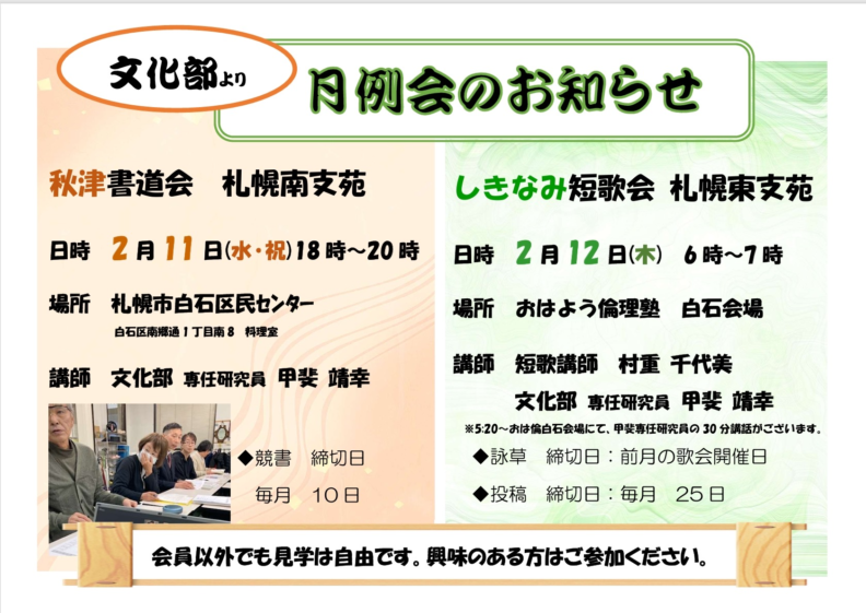 R8.2.11 秋津書道会・R8.2.12 しきなみ短歌会 歌会のお知らせ Posted on 2026-01-30 by 家庭倫理の会北海道 Related Post R8.4.19 子育てセミナーのお知らせ R8.3.11 秋津書道会例会・3.12 しきなみ短歌会例会のお知らせ R8.2.14 純粋倫理基礎講座 第3講のお知らせ R8.2.14 栞の勉強会 (第17条) のお知らせ R8.1.7 秋津書道会 例会・1.8 しきなみ短歌会 歌会のお知らせ